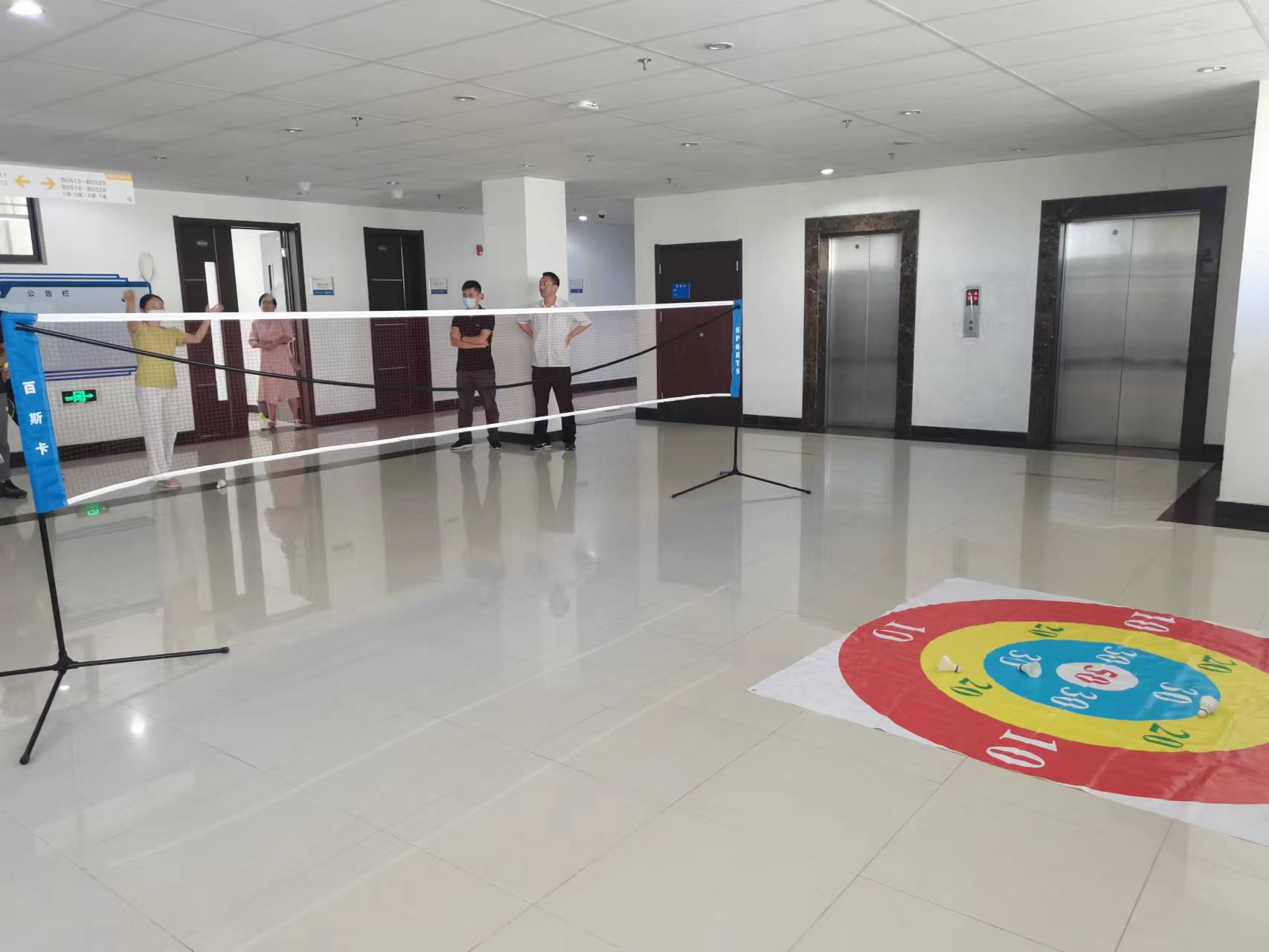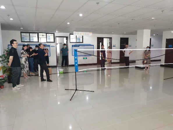 本活动中,击球人员站在标志线后,使用羽毛球拍击打羽毛球,打向球网对面计分区,每人五个球,以最后羽毛球落在计分毯的分数区作为最终成绩,由专人记录投中次数,以成绩高低设立一等奖和二等奖。
