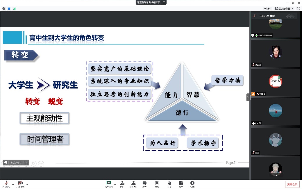 肖峰从学习责任、科研责任、发展责任和助手责任四个研究生基本责任出发,结合自身体会分析研究生的“茫、盲、忙”等典型心理问题,建议研究生要在实践中不断提升自我,培养自身的责任心、荣誉感、沟通能力、科学素养等品质。肖峰认为,导师是研究生“求学、求职、求友”过程中的激发者、引路者、训练者和支持者,学生需要敬重导师,导师需要关爱学生,建立融洽的师生关系,形成良好循环。