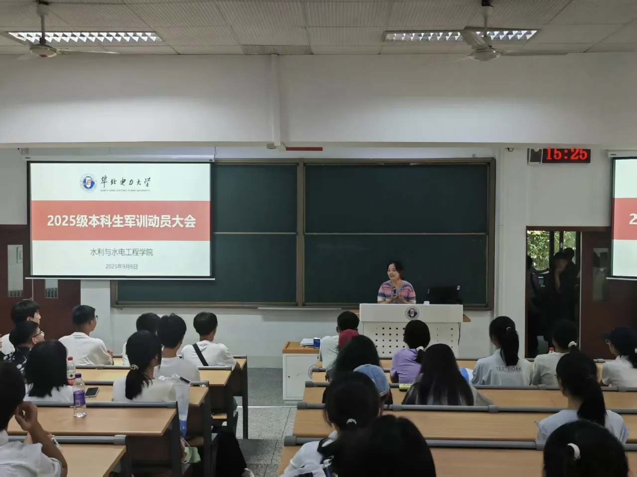 新生家长见面会结束后,学院紧接着召开了2025级本科生军训动员大会。宋辉斐详细介绍了新生军训期间的整体安排和相关要求,并提醒新生加强安全意识,谨防各类诈骗。