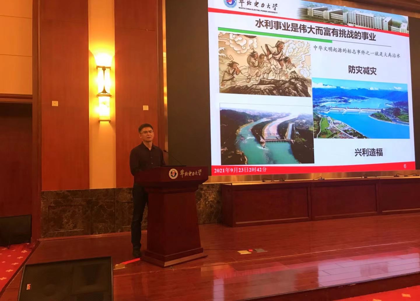 张尚弘为新生讲授“开学第一课”。他指出,水利事业是伟大而富有挑战的事业,关乎国计民生。同时从国家能源战略需求的角度出发,详细介绍了我校水利学科特色、专业培养目标和学生就业情况。